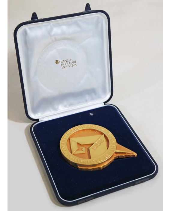 Prudentia et previdentia, 1998. Medaglia commemorativa in bronzo dorato per Banca Popolare Vicentina, firma e data incise, con custodia originale.