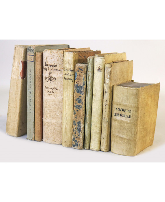 Lotto di dieci volumi: M. Piazzi Smyth. La grande pyramide pharaonique de nom humanitaire de fait. Parigi. 1875; Trattato di miniatura. Venezia, 1802; Beroso. Antiquitatum Italiae ac totius orbis. Antverpia, 1552; Veterum scriptorum de Sallustio testimonia, ab Aldo Manutio, Pauli f. collecta. 1562 (mancanze); P.D. Giovenale Sacchi Bernabita. Del numero e delle misure delle core musiche e loro corrispondenze. Milano, 1761; Emerico Brulon. Pratica di geometria in carta e in campo. Roma, 1746; Onofrio Panvino. De ludis circensibus, libri II, De triumphis, liber unus. Parigi, 1601; P. Godefrido Behm. Polymetrum. Salisburgo, 1672; Girolamo Ruscelli. Il rimario. Venezia, 1827; Antiquae historiae ex XXVII authoribus collextae. Lugduni, 1691
