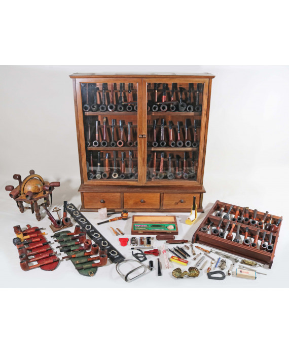 Lotto di 96 pipe di cui 47 di marca Pipa Castello, molte firmate da Carlo Scotti, un mobiletto portapipe con due sportelli a vetro e tre cassettini e vari accessori da fumo.