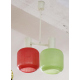 Lampadario a due luci con struttura in metallo verniciato bianco e due bobeches in vetro rosso e verde. Design degli anni '70/'80. Alt. cm68 (usure del tempo)