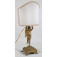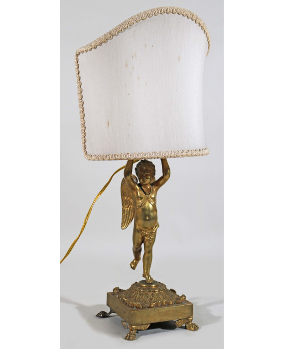 Lampada da tavolo in bronzo dorato con fusto a putto alato poggiante su base quadrata con quattro peducci a zampa. Francia, sec. XIX. Alt. cm28