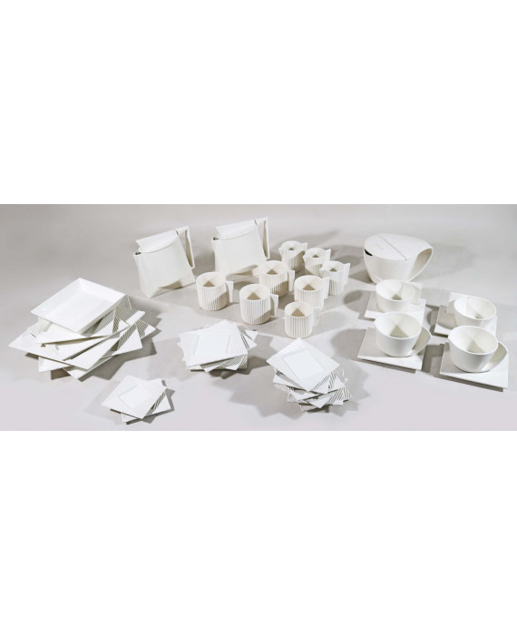 Lotto di due servizi da tè incompleti di marca Gien france: uno modello Eliakin composto da una teiera e quattro tazze con piattino ed uno modello Paco Rabanne composto da due teiere quattro tazze con piattini, tre lattiere, un bicchiere, un contenitore con piattino, quattro piattini e tre vassoi.