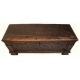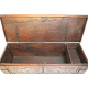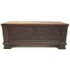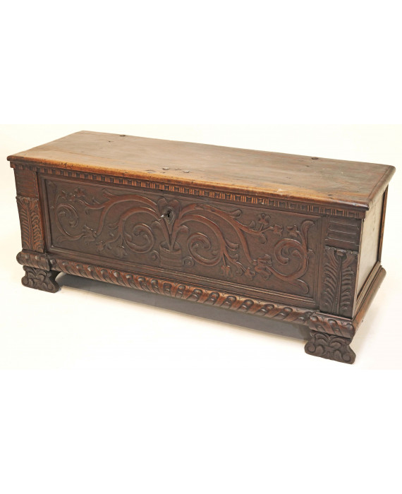Cassapanca in legno di noce con fronte intagliato a rami fioriti. Spagna, sec. XVII. cm62x157x55