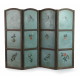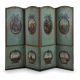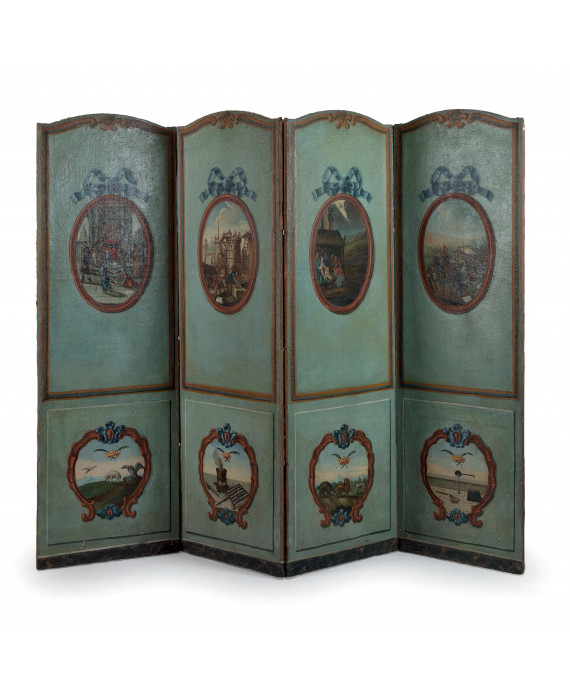 Paravento a quattro ante con struttura in legno intagliato e dipinto, con pannelli rivestiti in tessuto dipinto nel fonte e nel verso. Ogni anta è suddivisa in due registri: nel registro superiore riserve ovali con scene paesaggistiche e architettoniche animate da figure, città fortificate e ambienti rurali; nel registro inferiore riserve sagomate con scene simboliche e naturalistiche, animali e oggetti, impreziosite da piccoli motivi decorativi dipinti. Al verso ogni anta è suddivisa in tre registri: nel registro superiore piccoli uccelli posati su rami; nel registro centrale frutti (pera, arancia, melograno) resi con semplice naturalismo; nel registro inferiore motivi floreali stilizzati