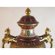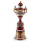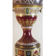 Vaso monumentale su piedistallo cilindrico in porcellana a fondo rosso magenta, decorazioni in oro a serti vegetali, fasce dipinte con scene di putti, anse a grifoni alati, marcato sul fondo in blu Royal Vienna. Austria, sec. XIX. Alt. cm104