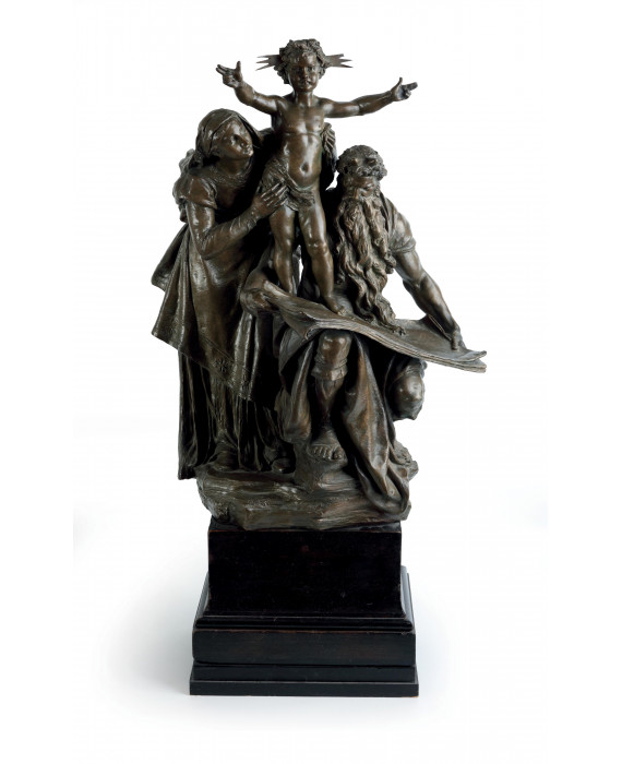 Otto Konig (1838-1920). Gesù Bambino con Madonna e Mosè con pergamena. Gruppo in bronzo patinato, firmato in basso, sul retro data 1893 e esemplare I/II, su base in legno ebanizzato. Alt. cm67x47x33 (piccola mancanza)